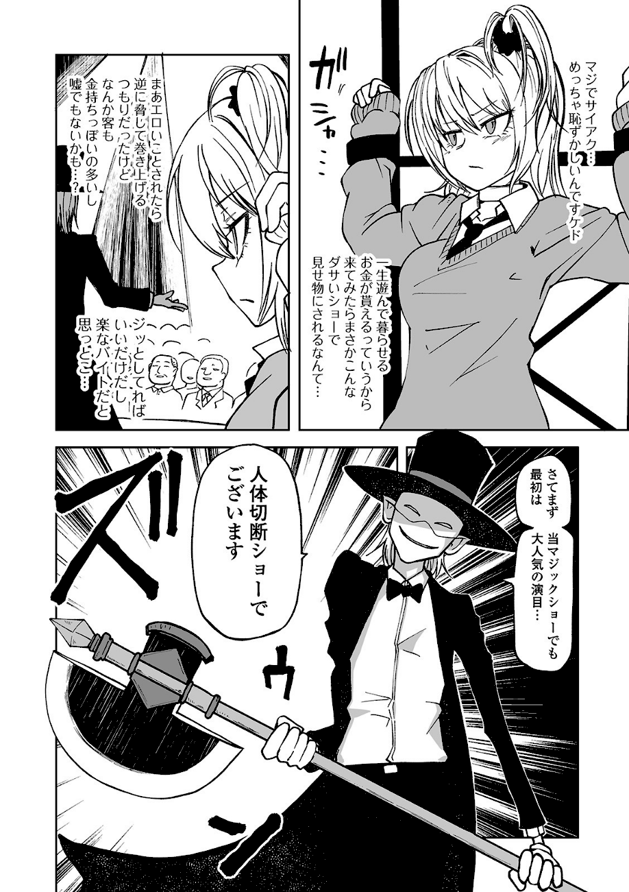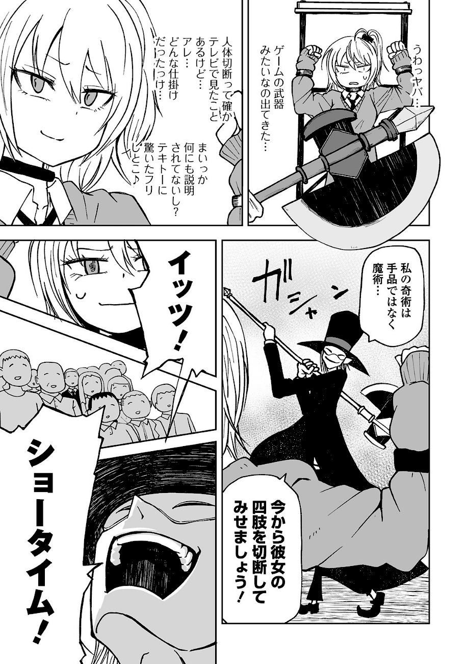 新進気鋭のリョナ作家、本誌初登場!! 高額なバイト代に釣られてマジックショーのショーガール役をする事になった少女はマジシャンの振りかざす大鎌で本当に腕を切断されてしまうのだが……。抜群のリョナ&ギャグセンスが高度にミックスされた本誌初掲載作!!※ この作品はアンソロジーコミック「リョナキング vol.7」に 収録されている作品の単話配信です。