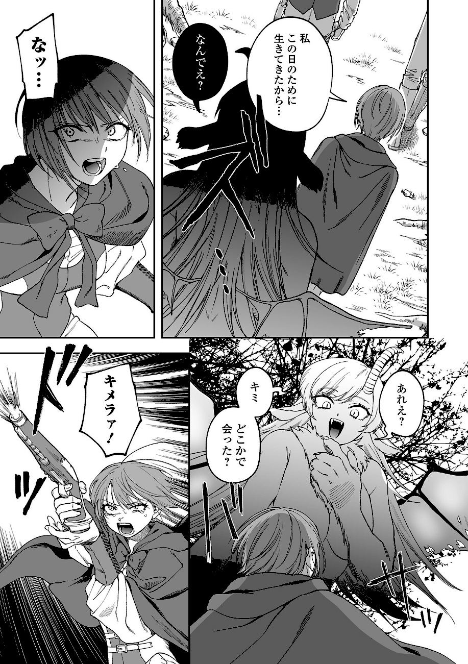 本誌初登場! 幼い頃に眼前で親をキメラに殺害された少女は10年後、復讐心をたぎらせてキメラ狩りの戦士となっていた。仲間たちと共に森を進んでいると、まったく気配なく接近したキメラによって仲間たちが全滅してしまう。銃弾も利かないキメラに片足を捻り潰された少女は何とか生き延びようと足掻くのだが……。※ この作品はアンソロジーコミック「リョナキング vol.29」に 収録されている作品の単話配信です。